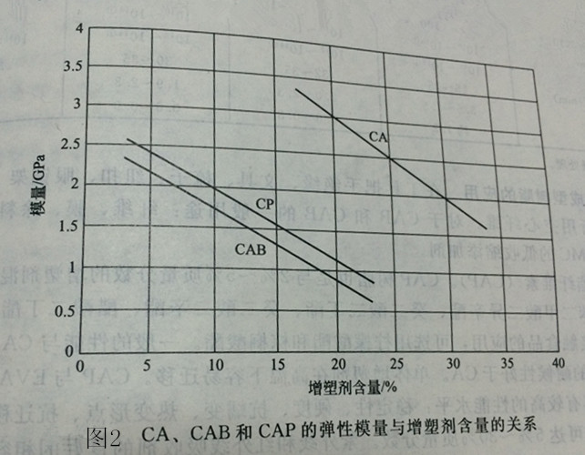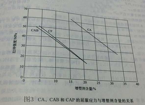 性能、应用:醋酸酯纤维素随着醋酸酯含量的增加,CA的黏度也在增加:近似于44%-48%低黏性,应用在纺织产品、印刷油墨;近似于52%-56%中黏性,应用于模塑材料牌号、涂料、黏合剂;56%-61%高黏性,应用在不燃性胶片、电绝缘膜。为了能够热塑性加工,15%-20%质量的增塑剂可被加入到树脂中:邻苯二甲酸二甲酯、邻苯二甲酸二乙酯、邻苯二甲酸二甲氧基乙酯、以及三氯乙磷酸与邻苯二甲酸二甲酯或邻苯二甲酸二乙酯组合使用,和仅与这些酞酸二丁酸、对苯二甲酸异丙酯和邻苯二甲酸二异辛酯组合。依据类型和增塑剂的用量,CA的性能可在一个很宽的范围内变化,如图2和图3所示。